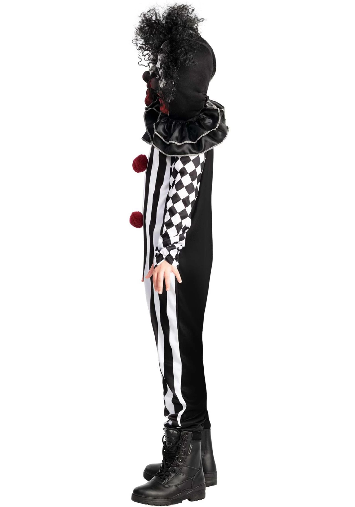 This costume is set to scare anyone who happens to pass by, and then get scared again when they see it at another angle! The set of masks are identical, with one resting off to the side on the left shoulder, and the other going around the real face. The jumpsuit is half diamond-patterned and half striped, with the sleeves inverted, which gives off a unsettling tone. The red pom-pom “values” look soft to squeeze, but we aren’t sure if we would want to get that close to try!