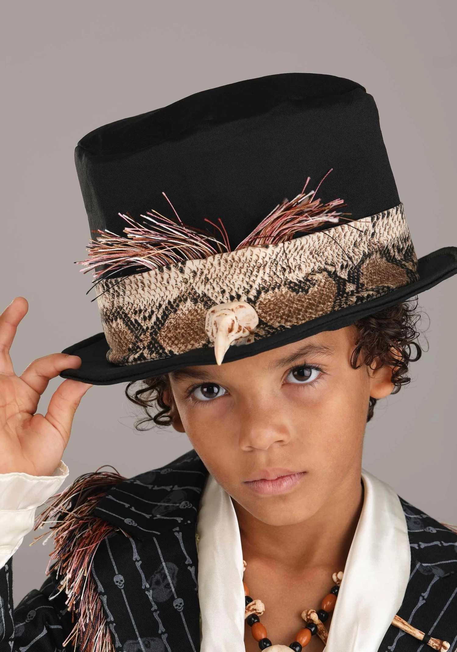You don’t need second sight to see that this exclusively designed Witch Doctor Costume for Boys is the perfect costume for Halloween! The jacket is printed all over with a skull and bone pinstripe-style pattern with fringe detail on the lapels. The white sewn-in shirt front has a ruffleed V-neck that’s perfect for displaying the twine necklace strung with orange and black beads and plastic bones. A plastic shrunken head is sewn to the right side of the jacket – a super cool and creepy touch that will make everyone think twice before asking you to share your candy. The ankle-length pants are printed with a matching bone pinstripe and look fantastic when worn with your favorite pair of boots. Add the included top hat with its band of faux snakeskin for a truly bewitching finishing touch!