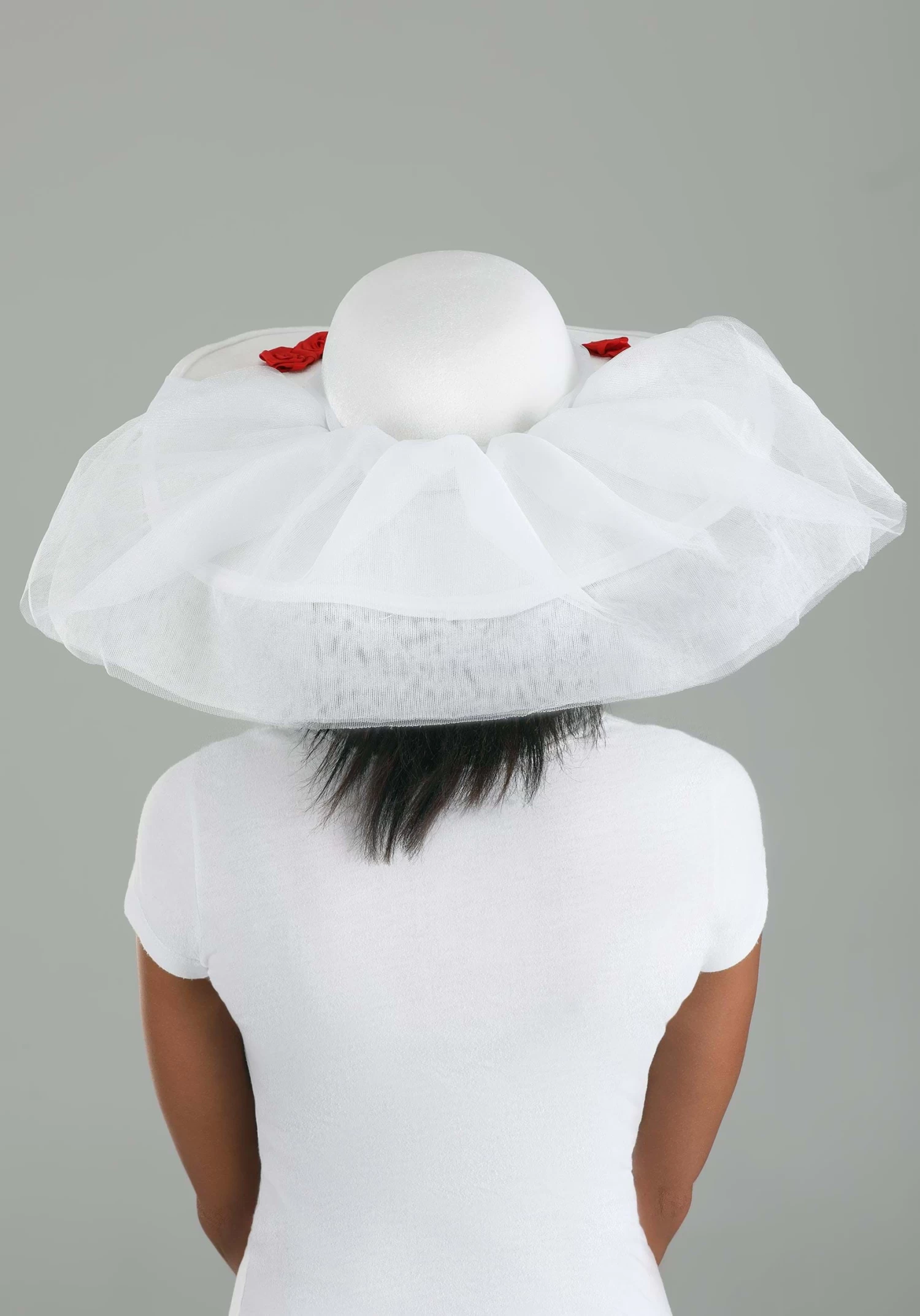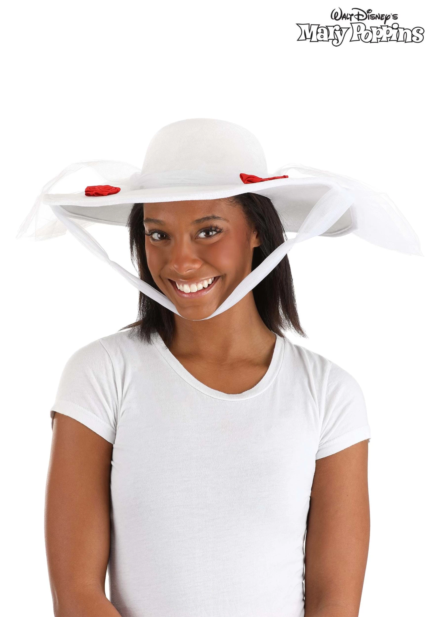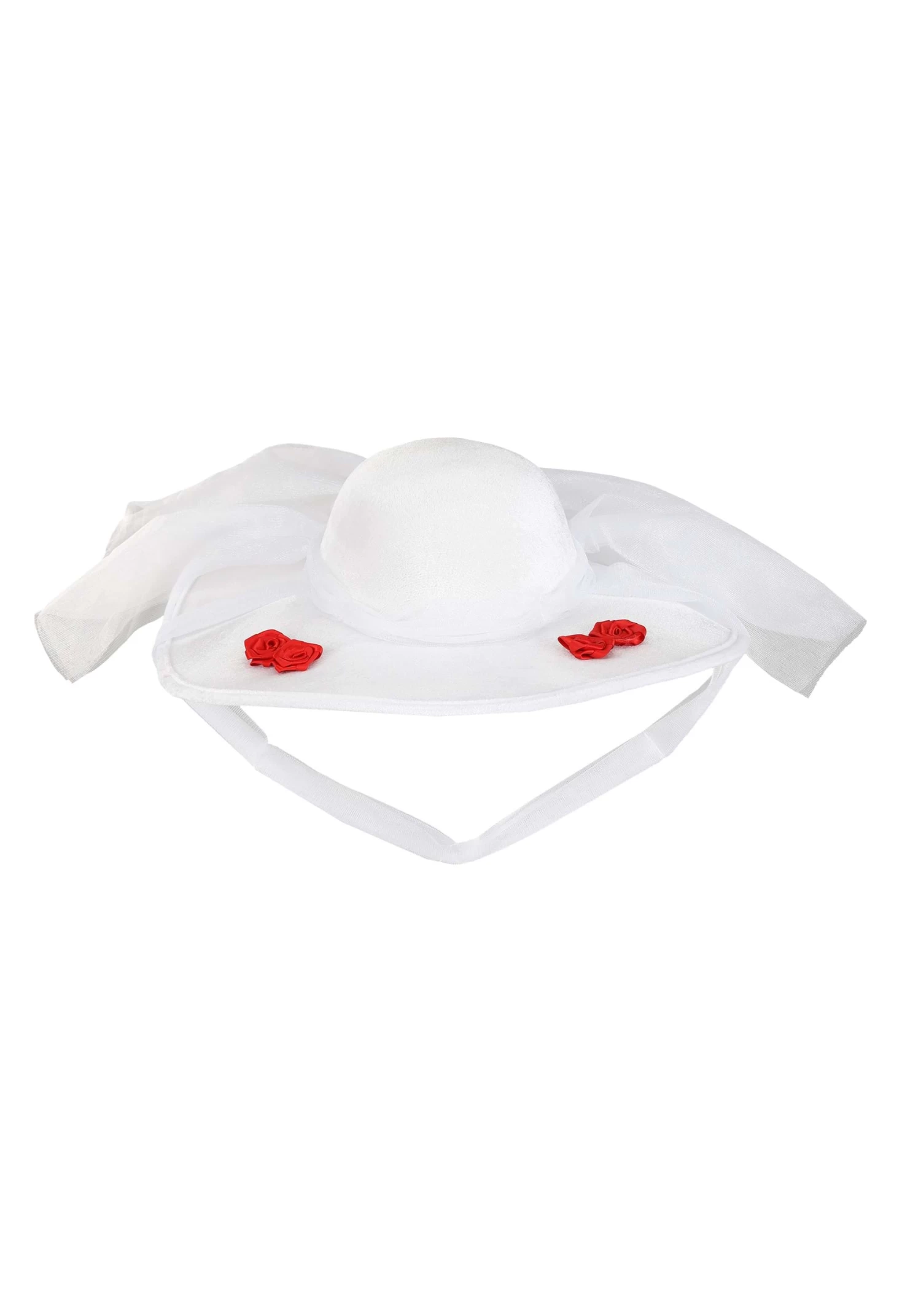 Follow Mary Poppins’ well-taught lesson when you add our exclusive Mary Poppin’s Jolly Holiday Hat to your costume! The licensed accessory, inspired by the outfit Mary wears to stroll a chalk-drawn countryside, starts with a sturdy white velour base. Its wide brim is decorated with red satin rosettes and semi-sheer white netting band and veil. Meanwhile, an attached chin strap offers to hold the lightweight accessory secure so the wearer’s holiday ensemble remains effortlessly chic!