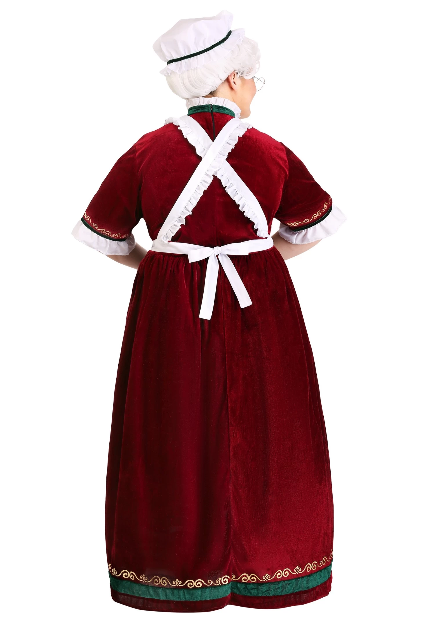 This women’s Christmas costume is a plus size outfit designed to give you a cheerful holiday look. The costume comes with a dark red velvet dress, that has gold detailing around the skirt and sleeves. The white apron has frilled edges and it even has small holly leaf designs on the bottom. To finish out this festive look, the costume comes with a white cap that matches the apron.