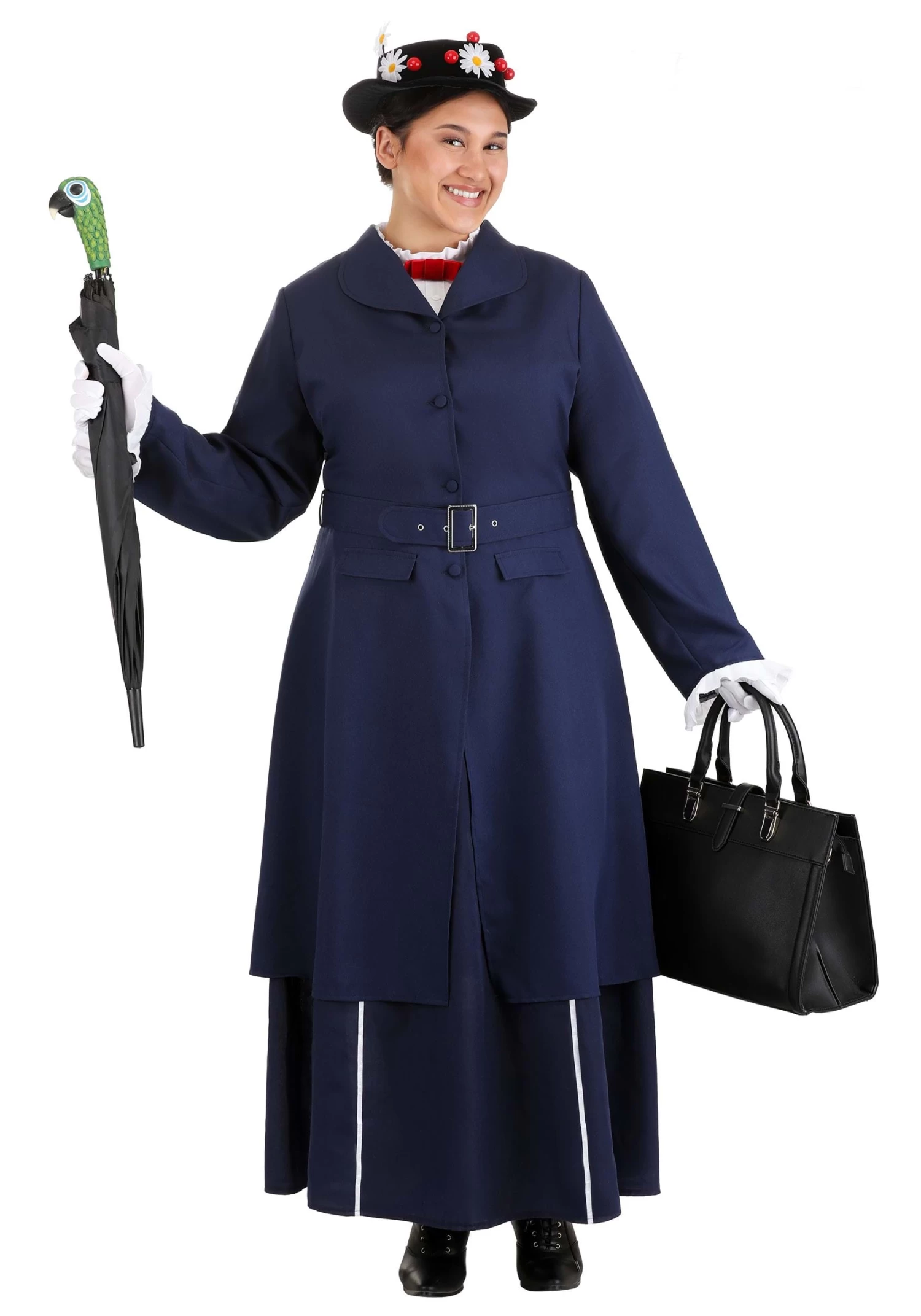 Borrow a little magic from this enchanting nanny with a Plus Size Mary Poppins Costume! The dress is made to look like a white value-down shirt and navy-blue skirt combined. A red bow at the throat adds a pop of color to the top. The matching navy-blue jacket adds a touch of elegance while still allowing the bow to peek through the top, and the belt adds some lovely detail at the waist. And of course, no outfit is complete without gloves and a hat! White gloves and a black hat decorated with flowers and red berries add the finishing touch. When you put on this authentic costume, you’ll be ready for a fabulous adventure with Bert, Jane, and Michael!