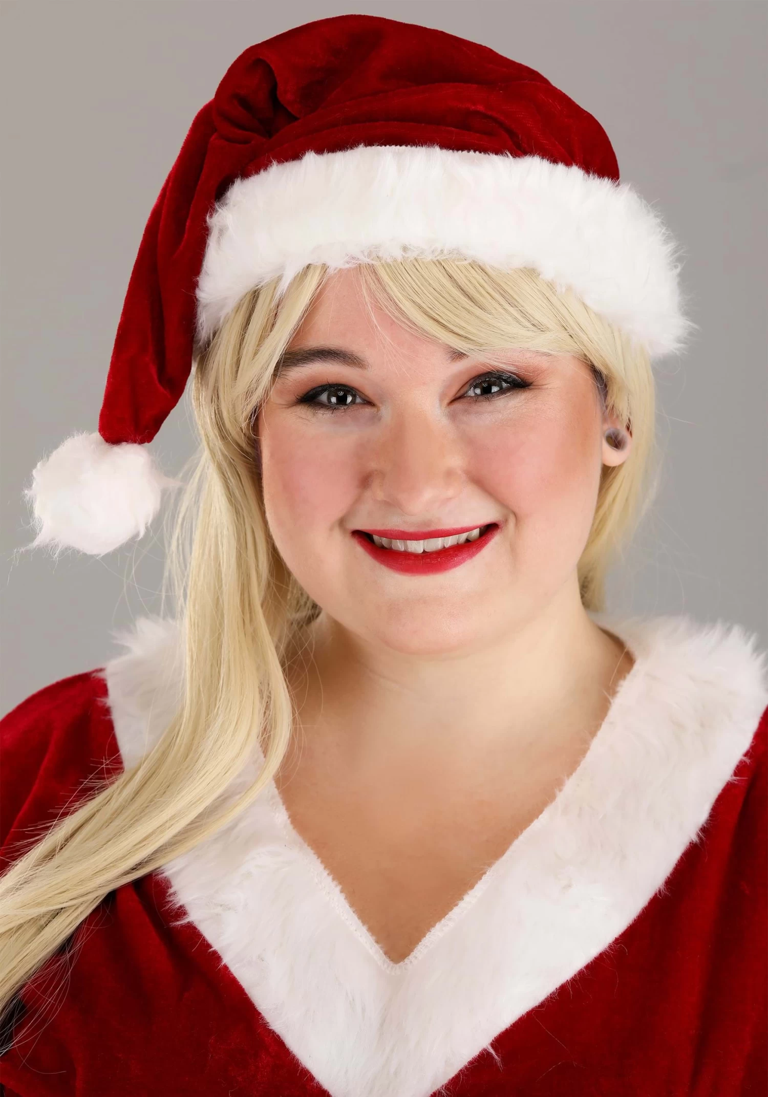 Our Santa Claus Sweetie costume is a plus size outfit that recreates Mrs. Claus’s look in impeccable style. The red velour dress has white faux fur trim and a modest v-neck bustline, providing a look that’s both comfortable and flattering. The black belt around the waist has a gold buckle. The matching red Santa hat finishes the costume with perfect yuletide spirit. Once you have the entire ensemble on, you may feel like baking some cookies, or throwing the best Christmas party on this side of the North Pole!