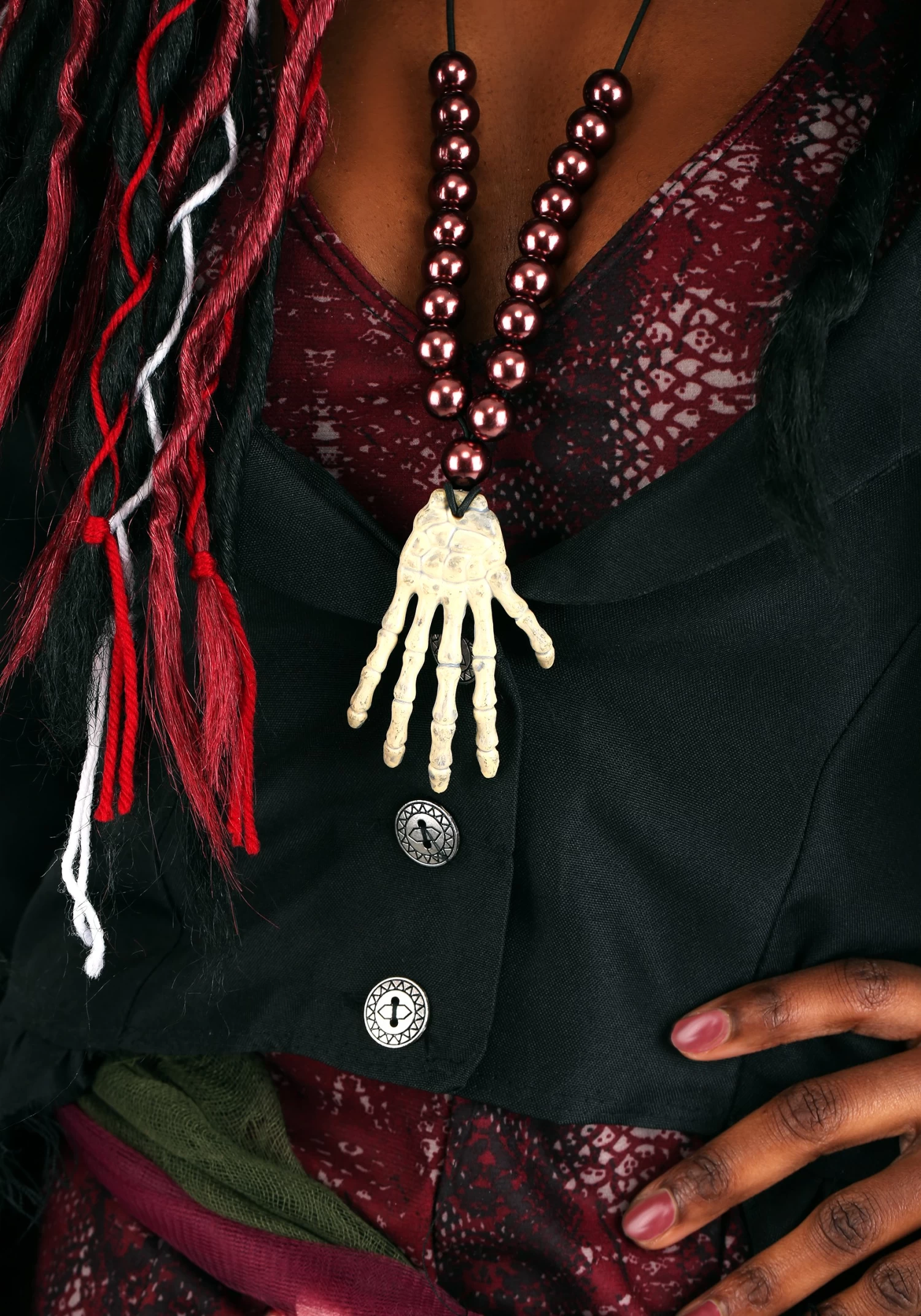 This gorgeous, layered look might just convince you that you actually could stir up some magic. The coat has a cropped center, showing off the snakeskin patterned vest underneath. You’ll also get the multi-colored sash ties that are layered under the bone and skull belt. A monkey hand necklace will remind folks of your other-worldly knowledge and the whole costume is polished off with the wrapped top hat.